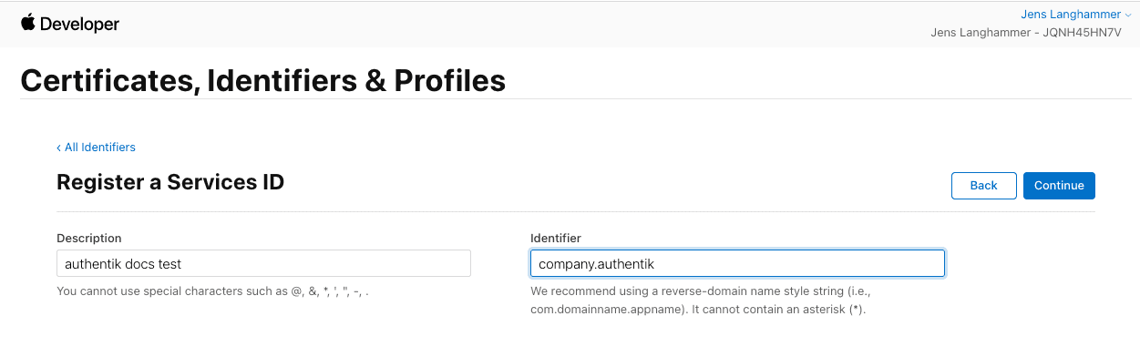 - For your bundle ID, use the reverse domain of authentik, in this case